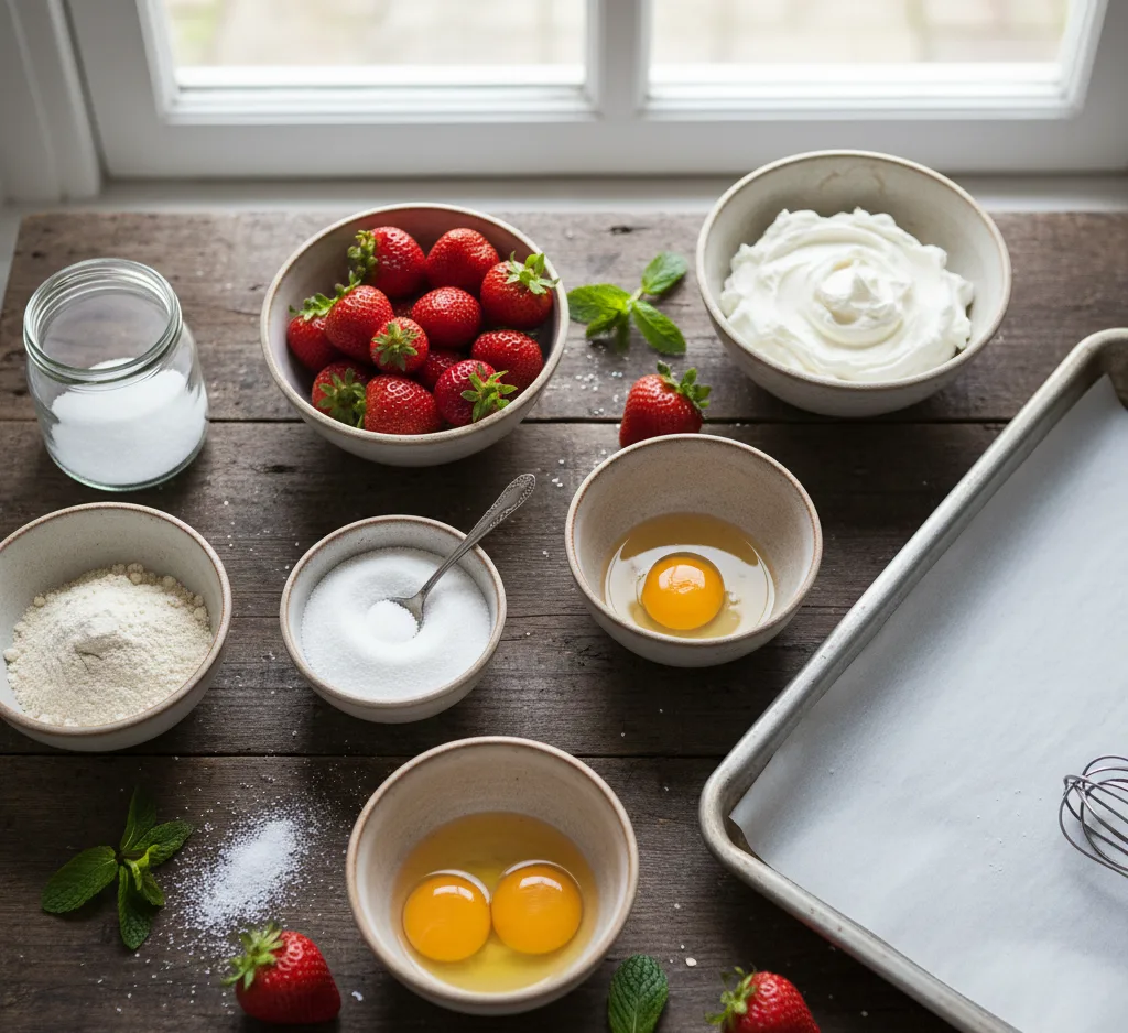 - Pečeno biskvitno podlago ohladimo, nato jo premažemo s stepeno smetano in jagodami.