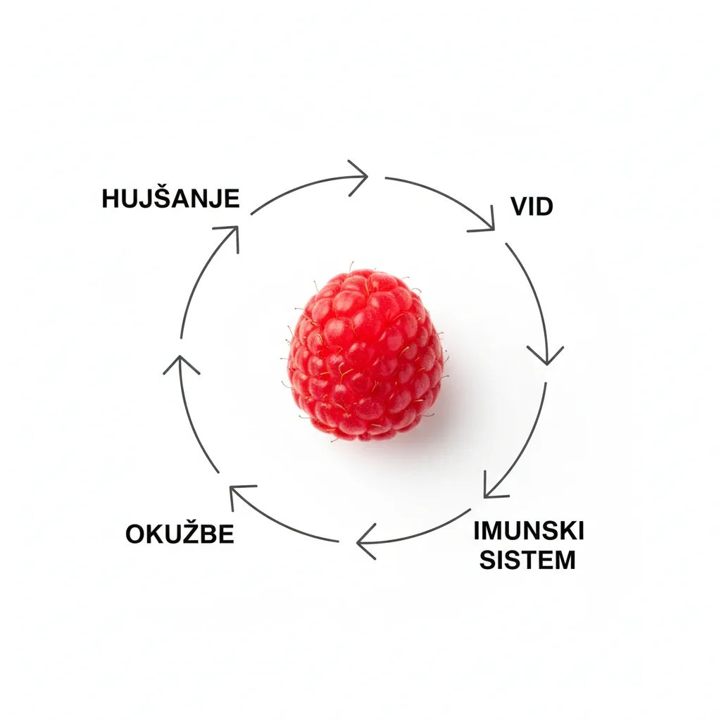 Maline so odličen naravni vir hranil, ki podpirajo imunski sistem. Vsebujejo vitamin C, riboflavin, folate, mangan, baker, kalij in magnezij, ki sodelujejo pri obrambi telesa pred okužbami in oksidativnim stresom. Vitamin C spodbuja proizvodnjo belih krvnih celic, ki so ključne pri boju proti bakterijam in virusom, medtem ko antioksidanti preprečujejo poškodbe celic. Minerali, kot so mangan in baker, sodelujejo pri tvorbi encimov, ki zmanjšujejo vnetja in pomagajo pri razstrupljanju telesa. Redno uživanje malin lahko skrajša trajanje prehladov, izboljša odpornost in okrepi naravno zaščito organizma. Poleg tega so maline bogat vir prehranskih vlaknin, ki podpirajo črevesno floro – ključni element imunskega sistema. Črevesje namreč proizvaja več kot 70 % imunskih celic telesa, zato je vključevanje malin v prehrano učinkovita strategija za celostno krepitev odpornosti in ohranjanje vitalnosti skozi vse leto.
