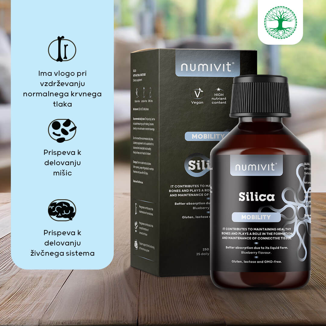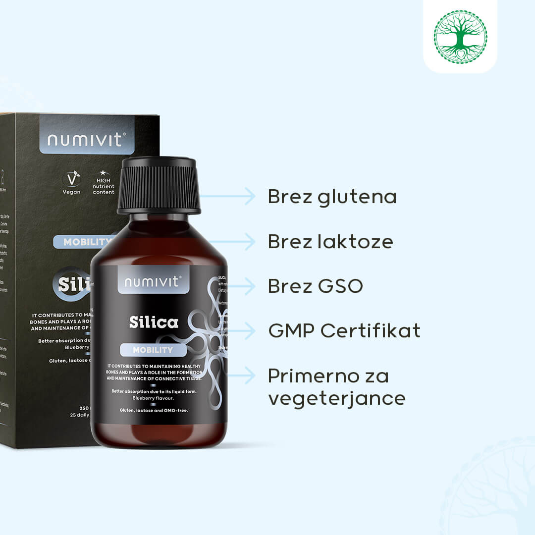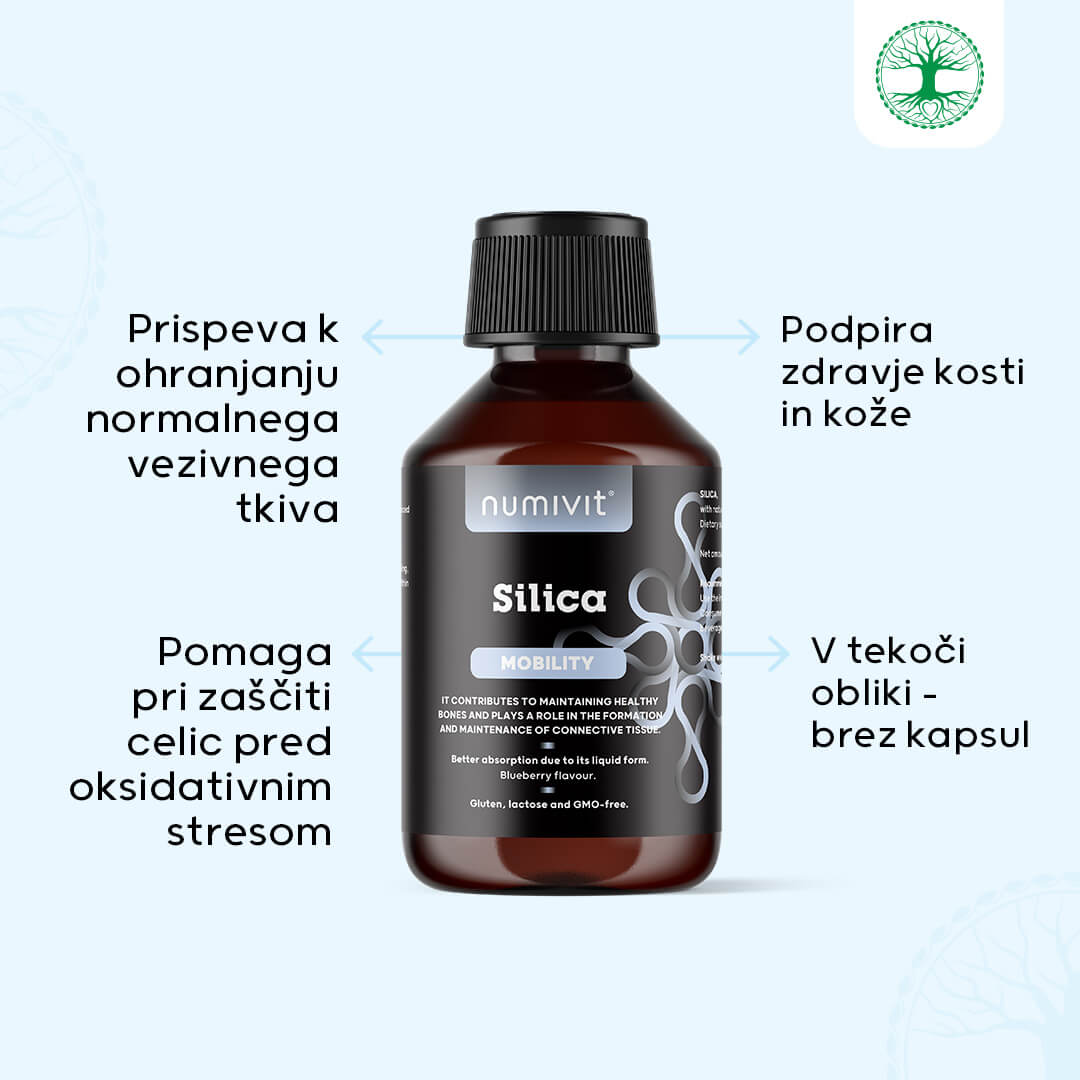 Tekoči silicij z manganom in bakrom za vsakodnevno podporo. Silicij je naravno prisoten v telesu, vključno s kožo, lasmi in vezivnim tkivom. Mangan in baker v izdelku prispevata k ohranjanju normalnega vezivnega tkiva. V tekoči obliki za enostavno uporabo – brez glutena, laktoze in GSO, primerno tudi za vegane.